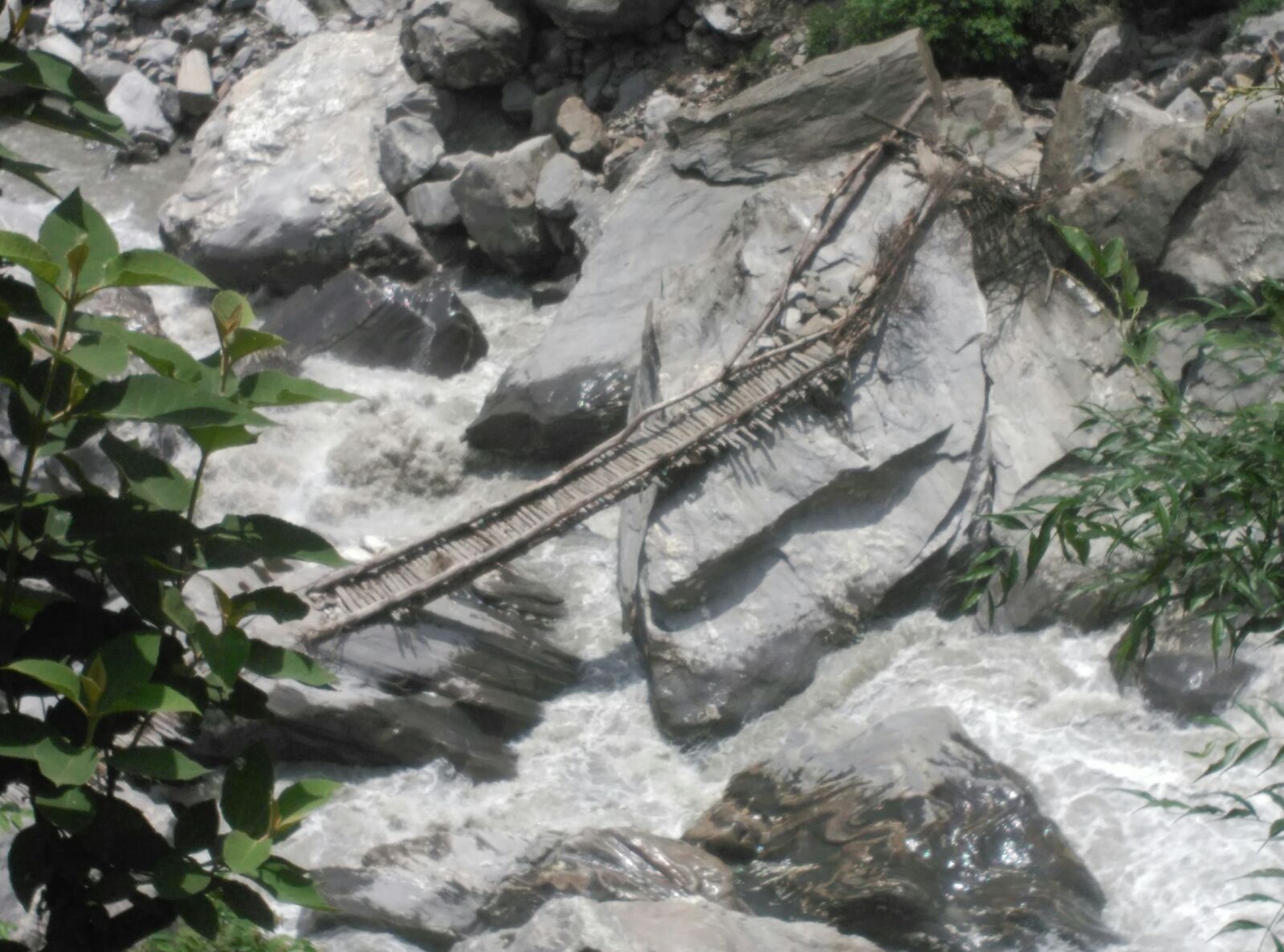 Los 20 kilómetros recorridos hasta Jagat han sido como un circuito de aventura. Dos de los puentes colgantes están rotos y una parte del camino se “lo ha comido” el río, así que la nueva ruta exige un esfuerzo físico extra de sube-baja, además de ciertas habilidades y buen equilibrio para atravesar un puente de madera montado sobre un caos de bloques. En realidad, que lo hayamos pasado nosotros no tiene ningún mérito, porque lo difícil es lo que han hecho los porteadores, cargando 30 kilos al lomo y con chanclas de piscina.